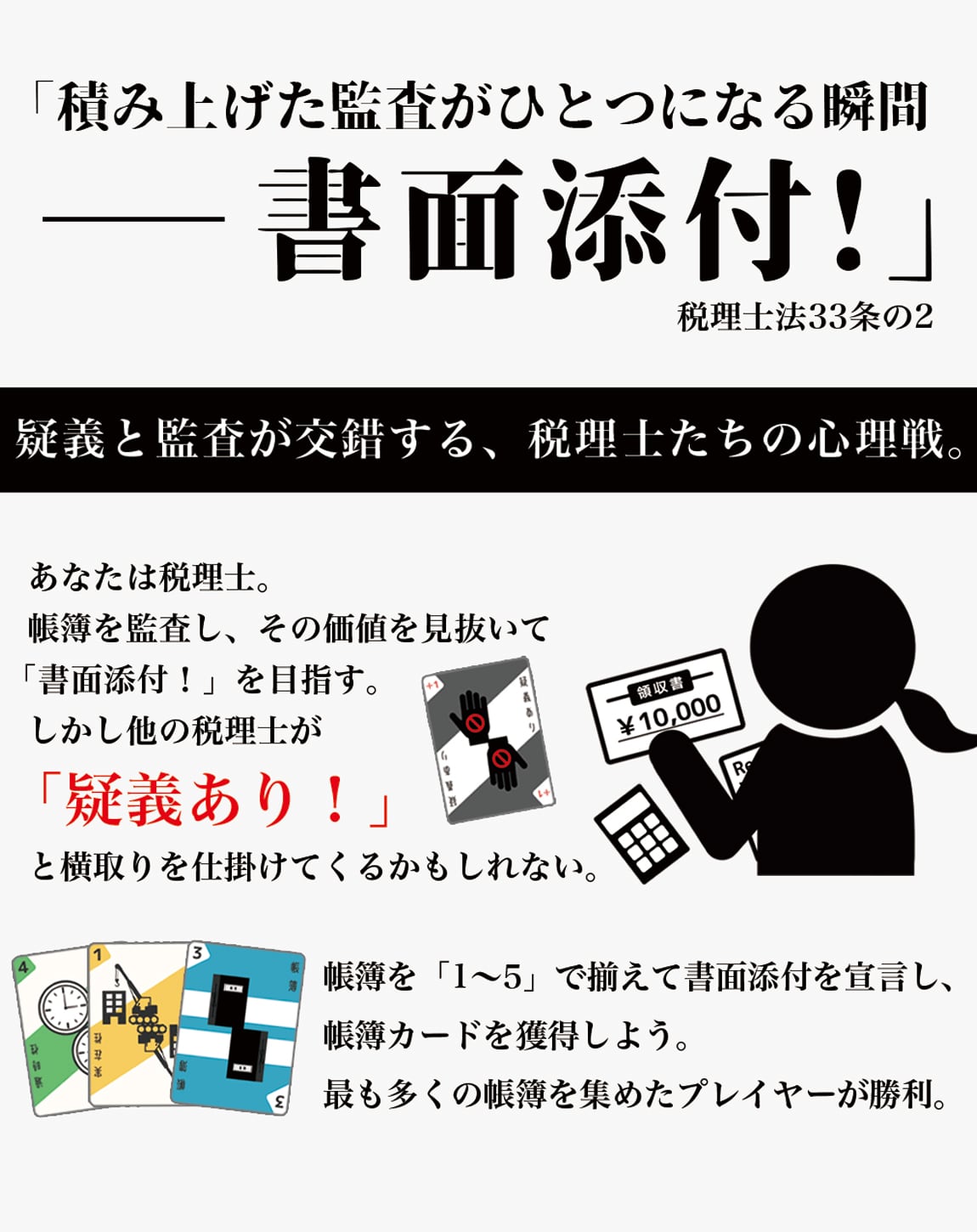 『書面添付:真実の証明』は、プレイヤーが税理士となり、帳簿の信頼性を監査カードによって検証しながら、真実の帳簿を完成させる心理戦カードゲームです。
